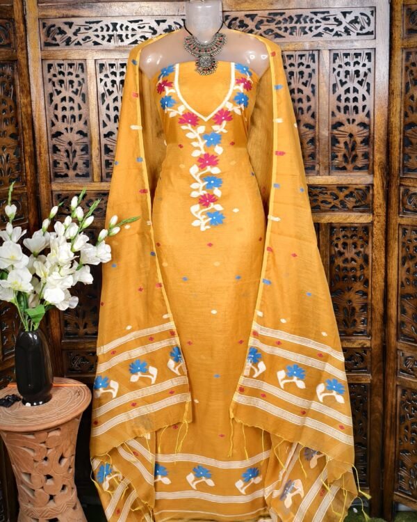 Four Leaf Yellow Unstitched Jamdani Kurti Set