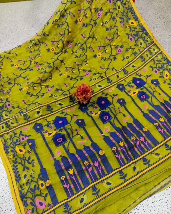 Ghar Pakhi Soft Yellow Green Jamdani Saree