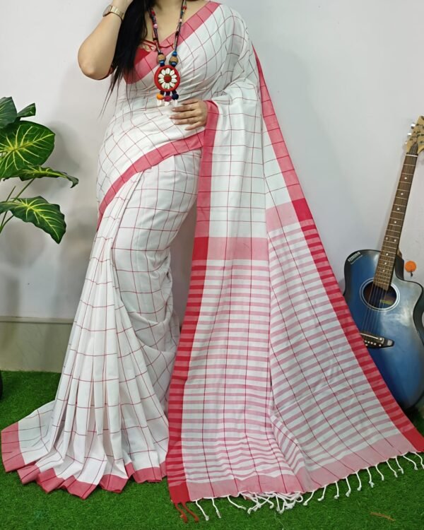 Manjuri Chek Cotton White Red Soft Saree