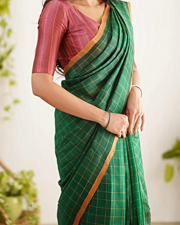 Manjuri Chek Cotton Bottol Green Soft Saree