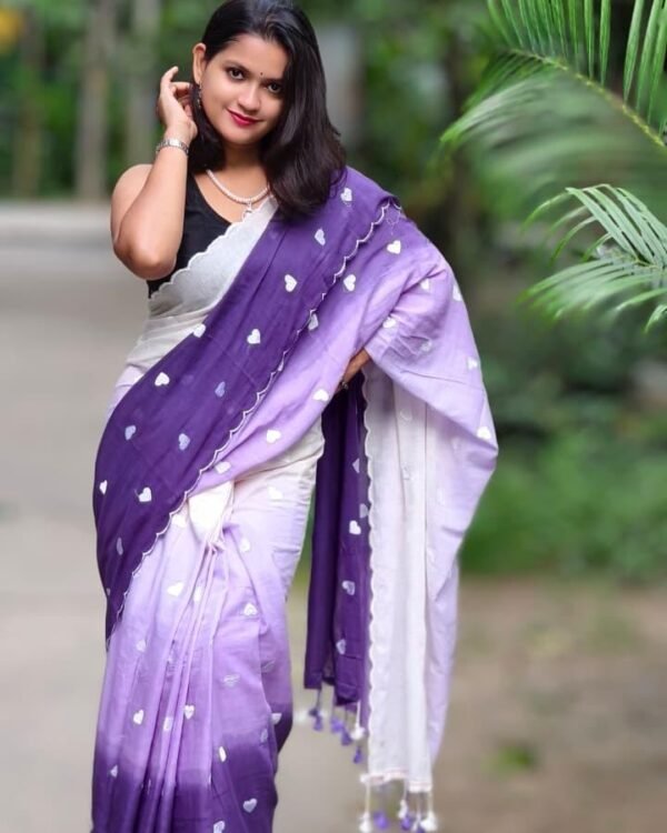 3D Mal Cotton White Purple Soft Saree