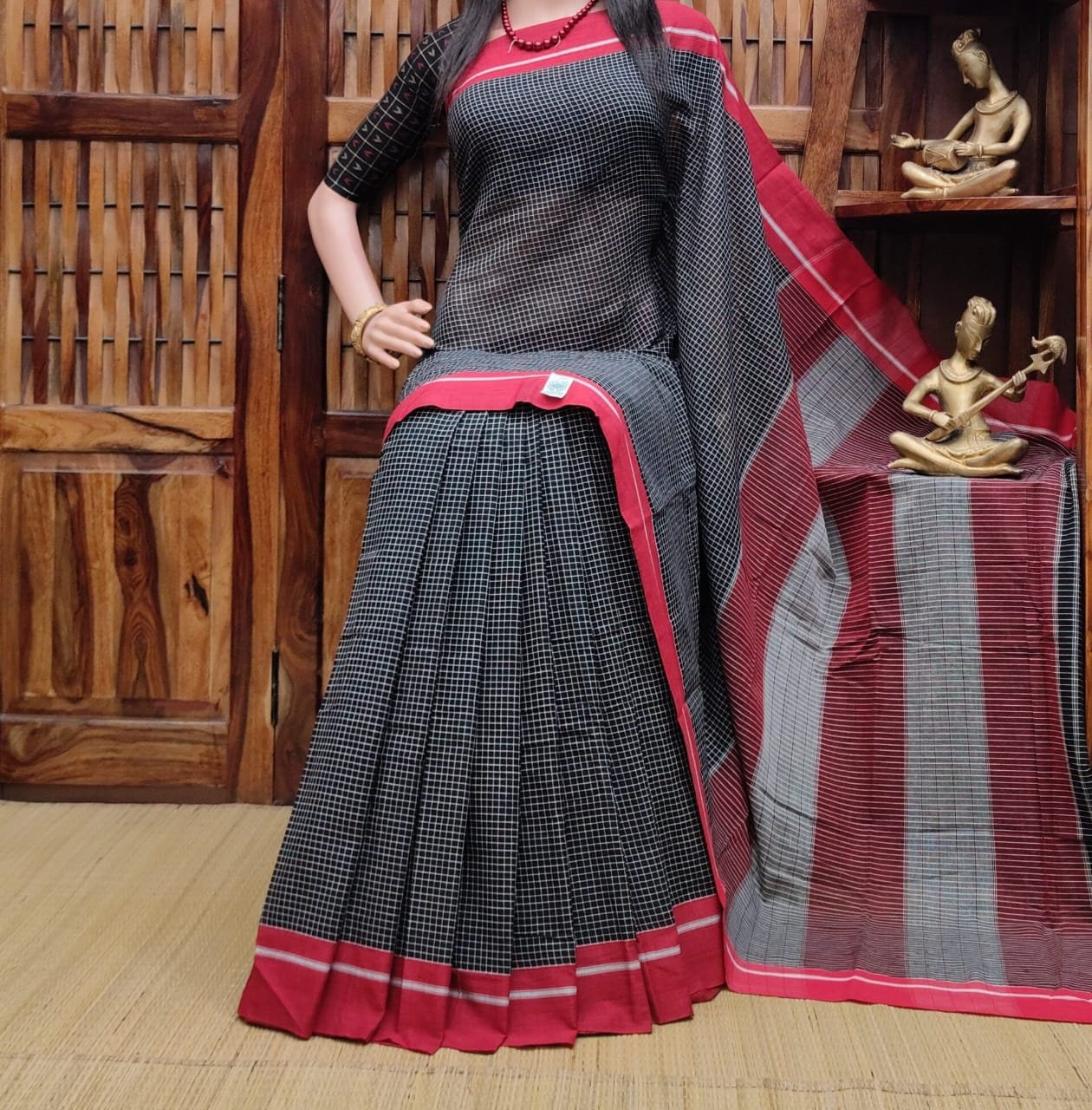 Border Mini Chek Black Red Soft Cotton Saree