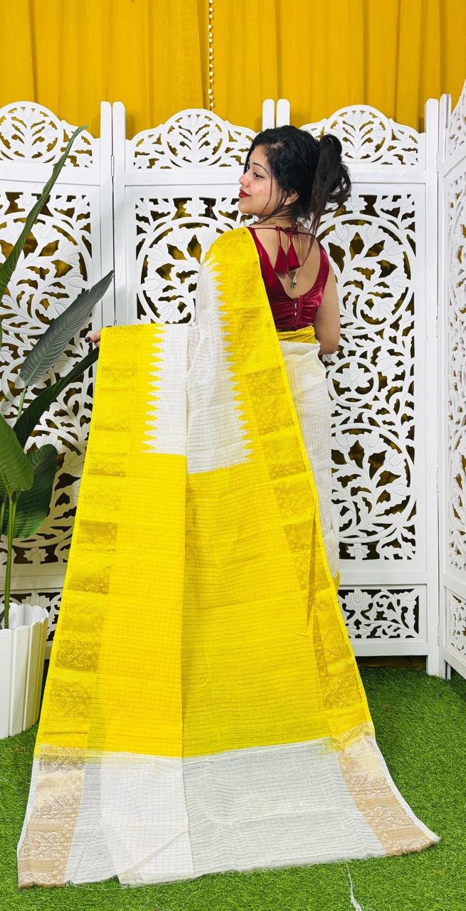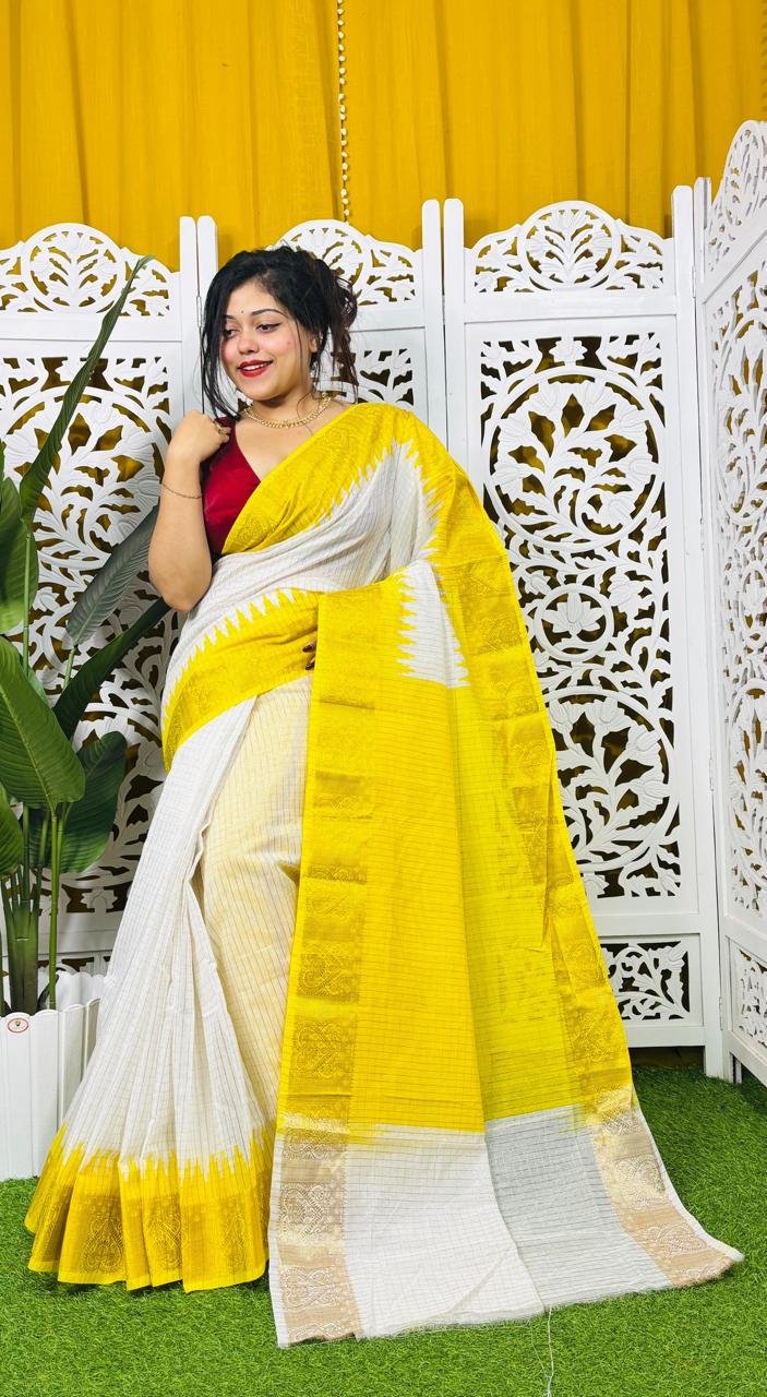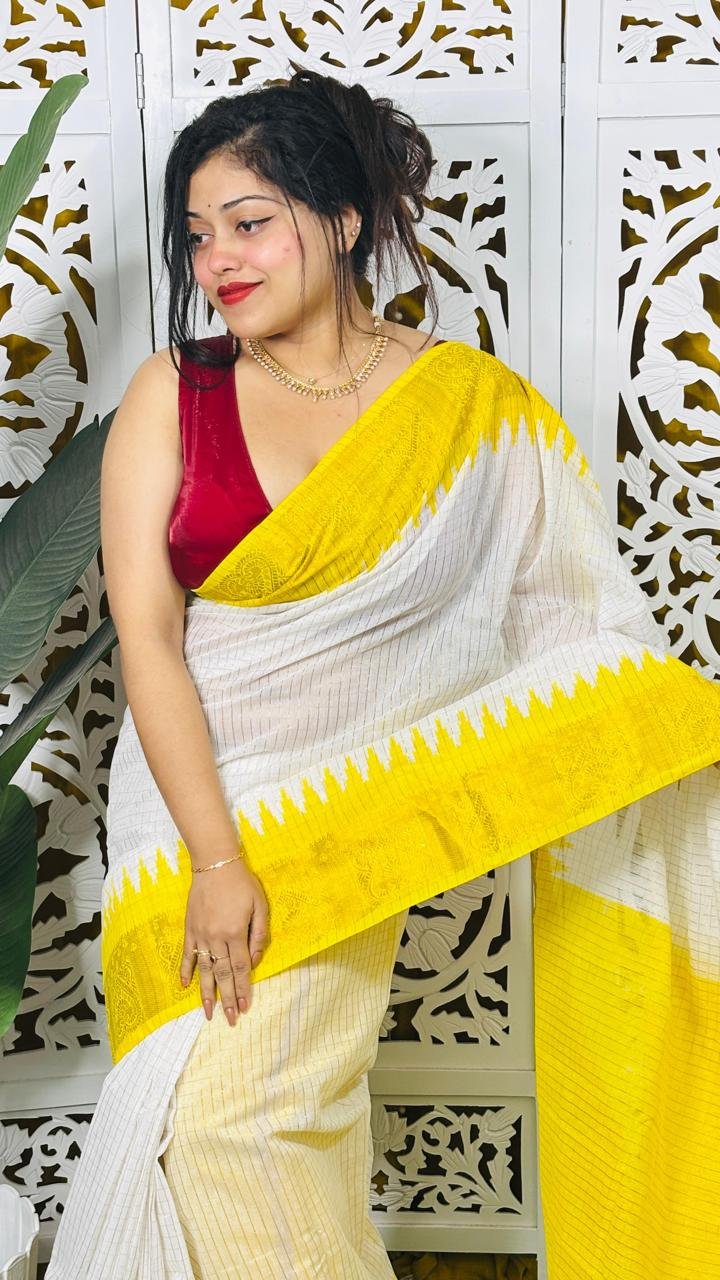 Madhurai Soft White Yellow Cotton Saree