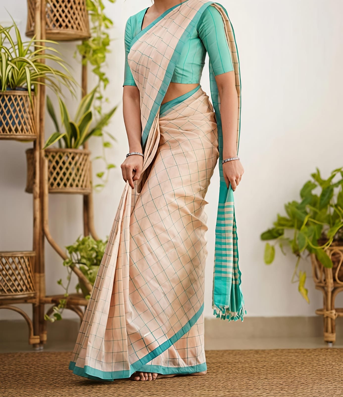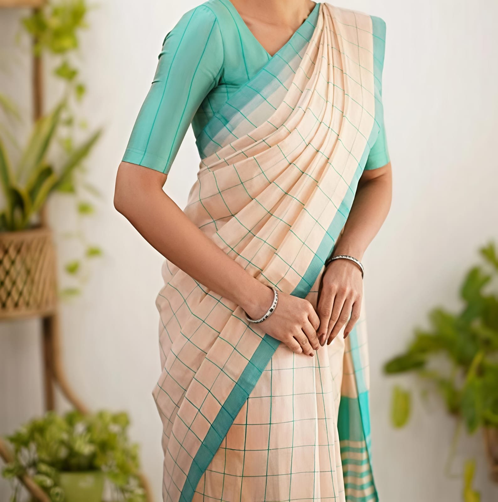 Manjuri Chek Cotton Cream C-Green Soft Saree