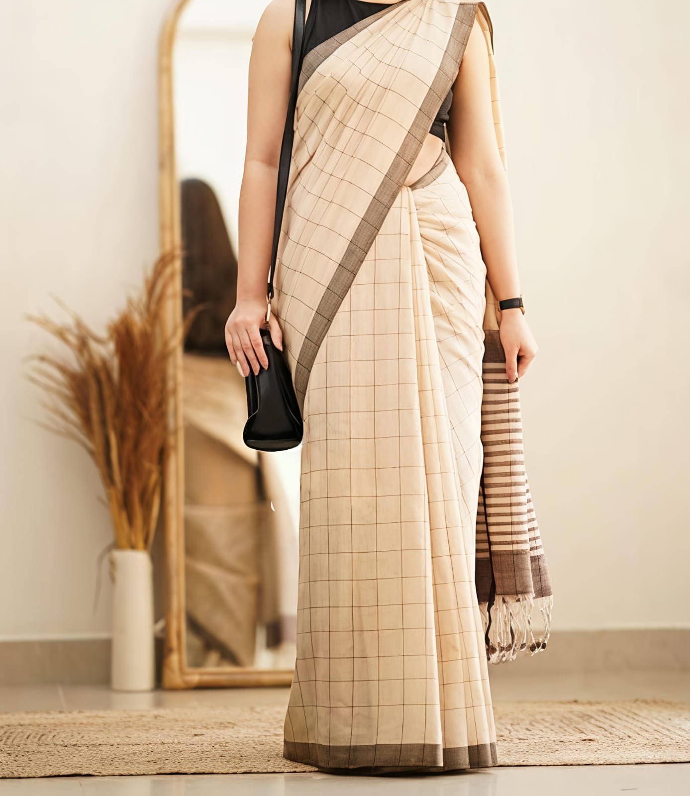 Manjuri Chek Cotton Light Brown Black Soft Saree