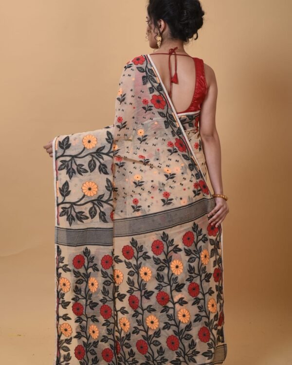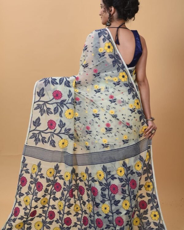 Exclusive Cream Blue Flower Soft Jamdani Saree