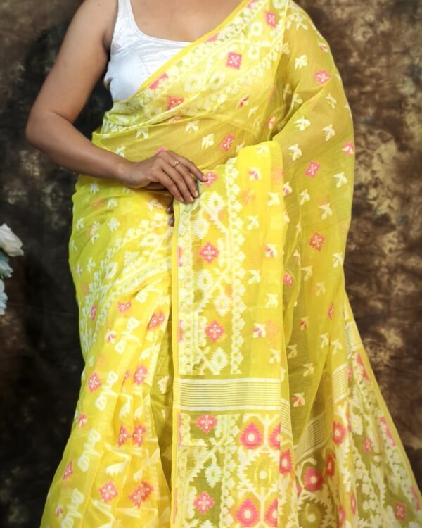 Lemmon Yellow Soft Allpona Dhakai Jamdani Saree
