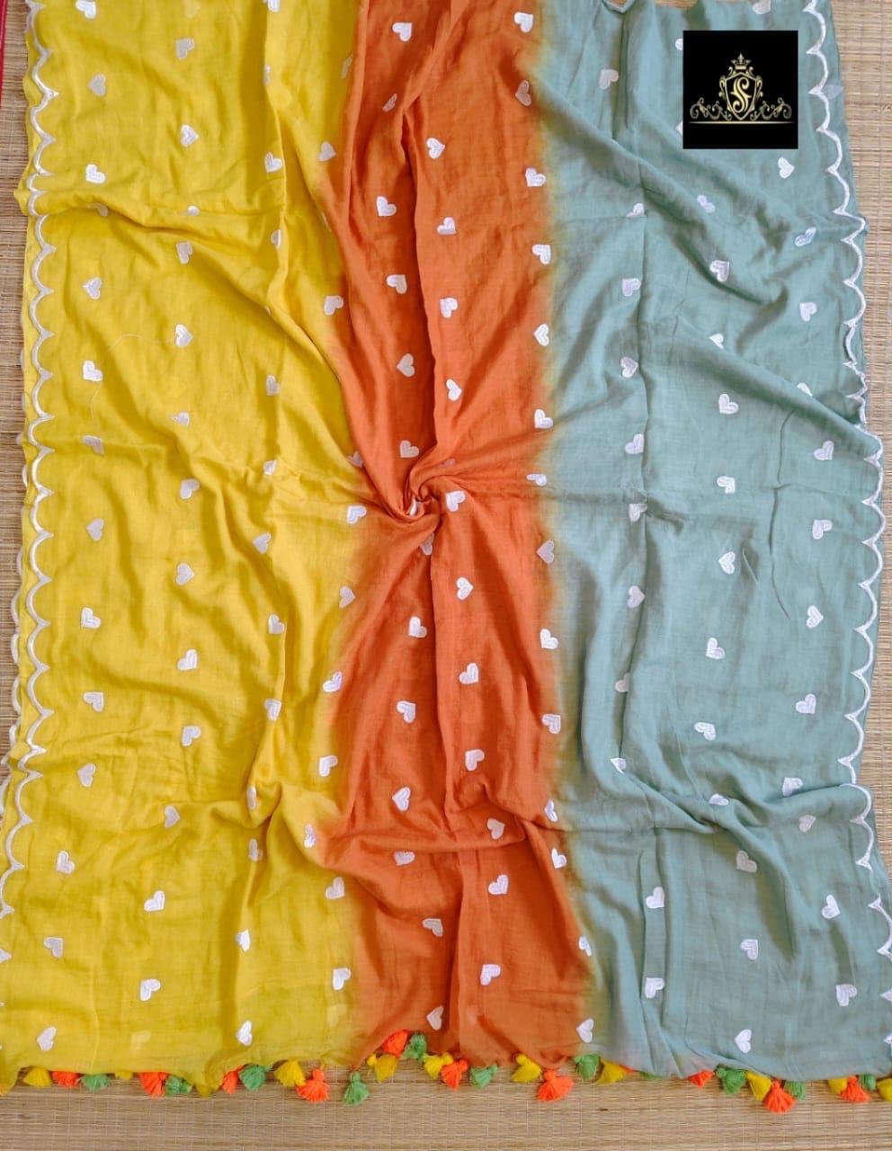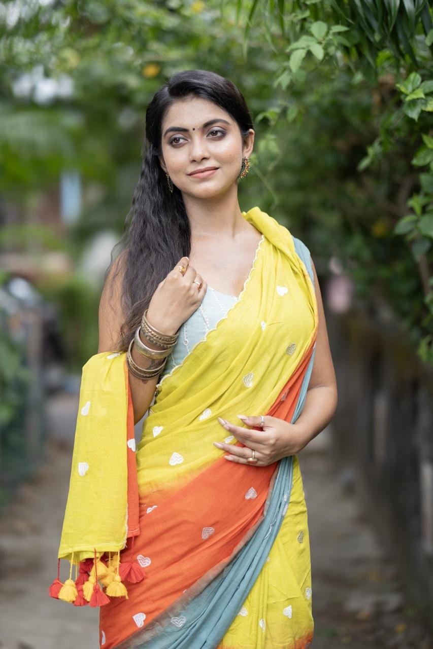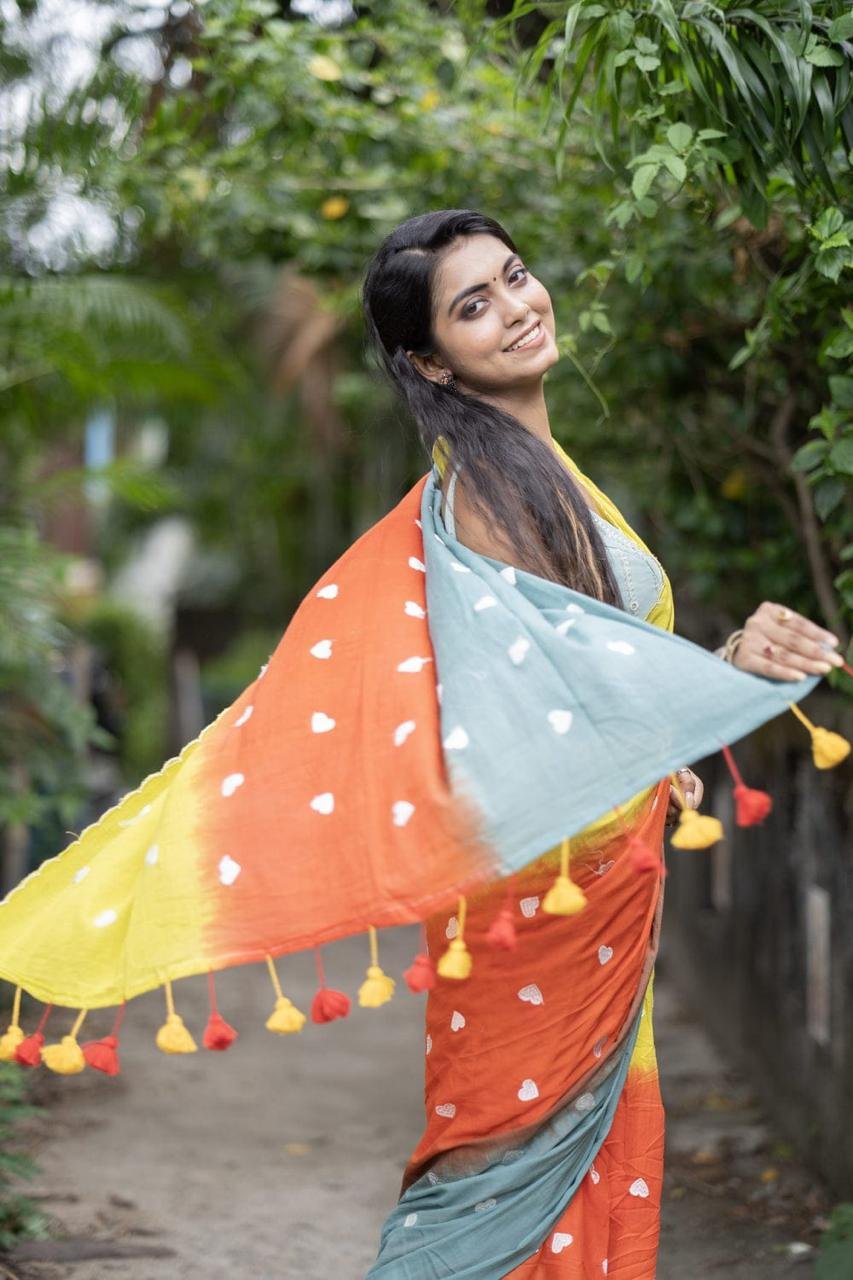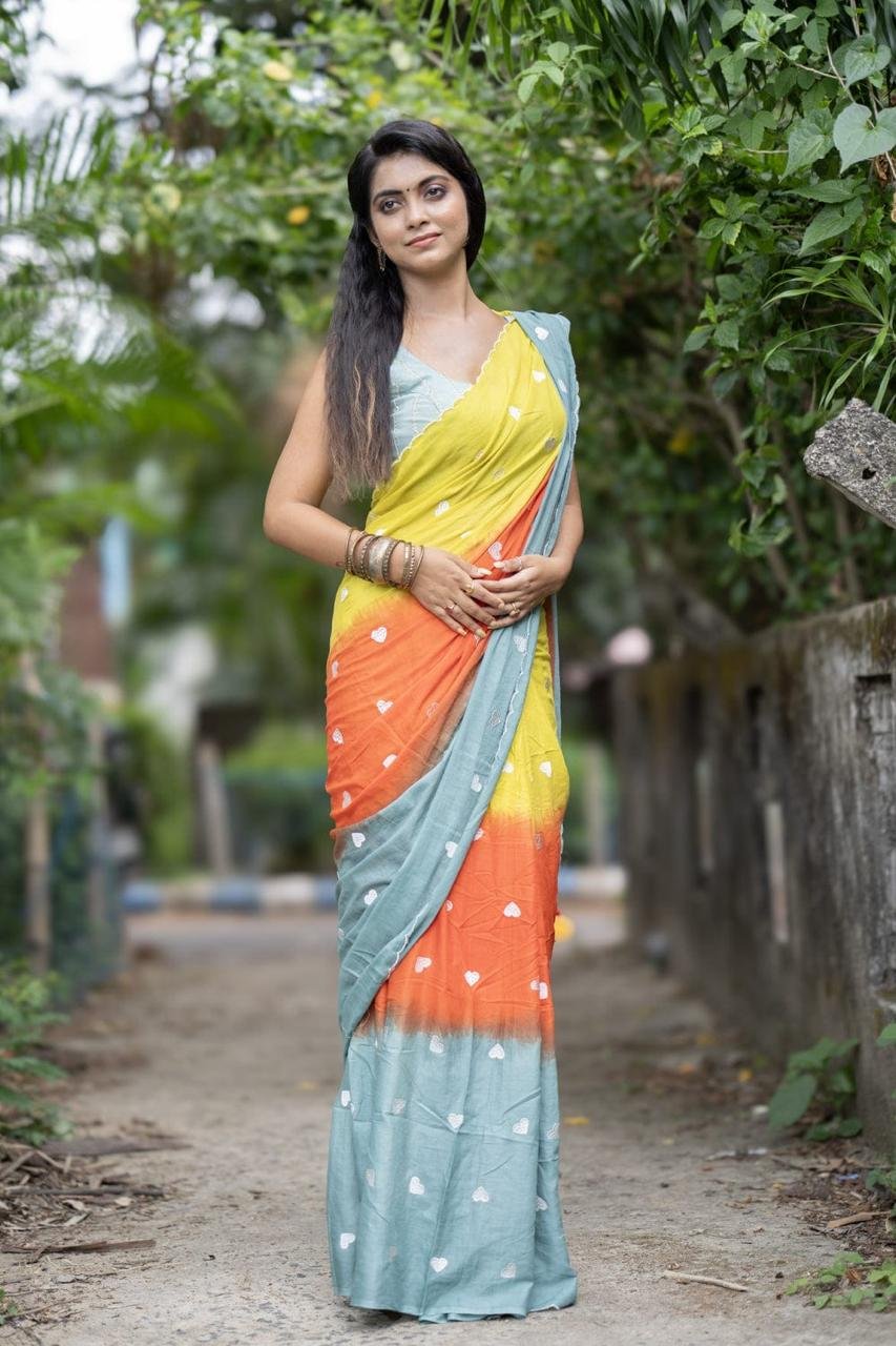 3D Mal Cotton Yellow Orange Soft Saree