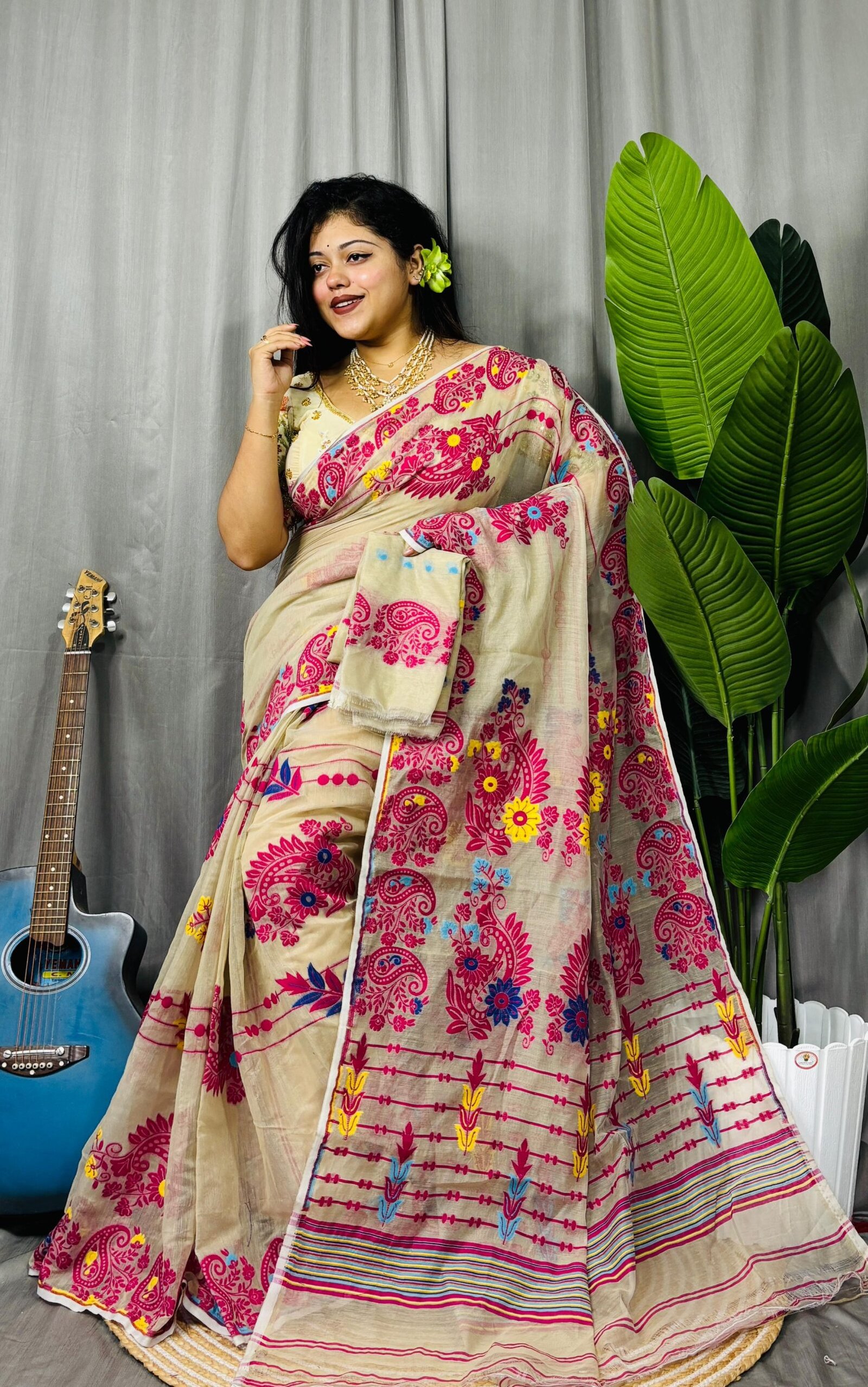 Excluclosive Banana Leve Borfi Design Jamdani Saree
