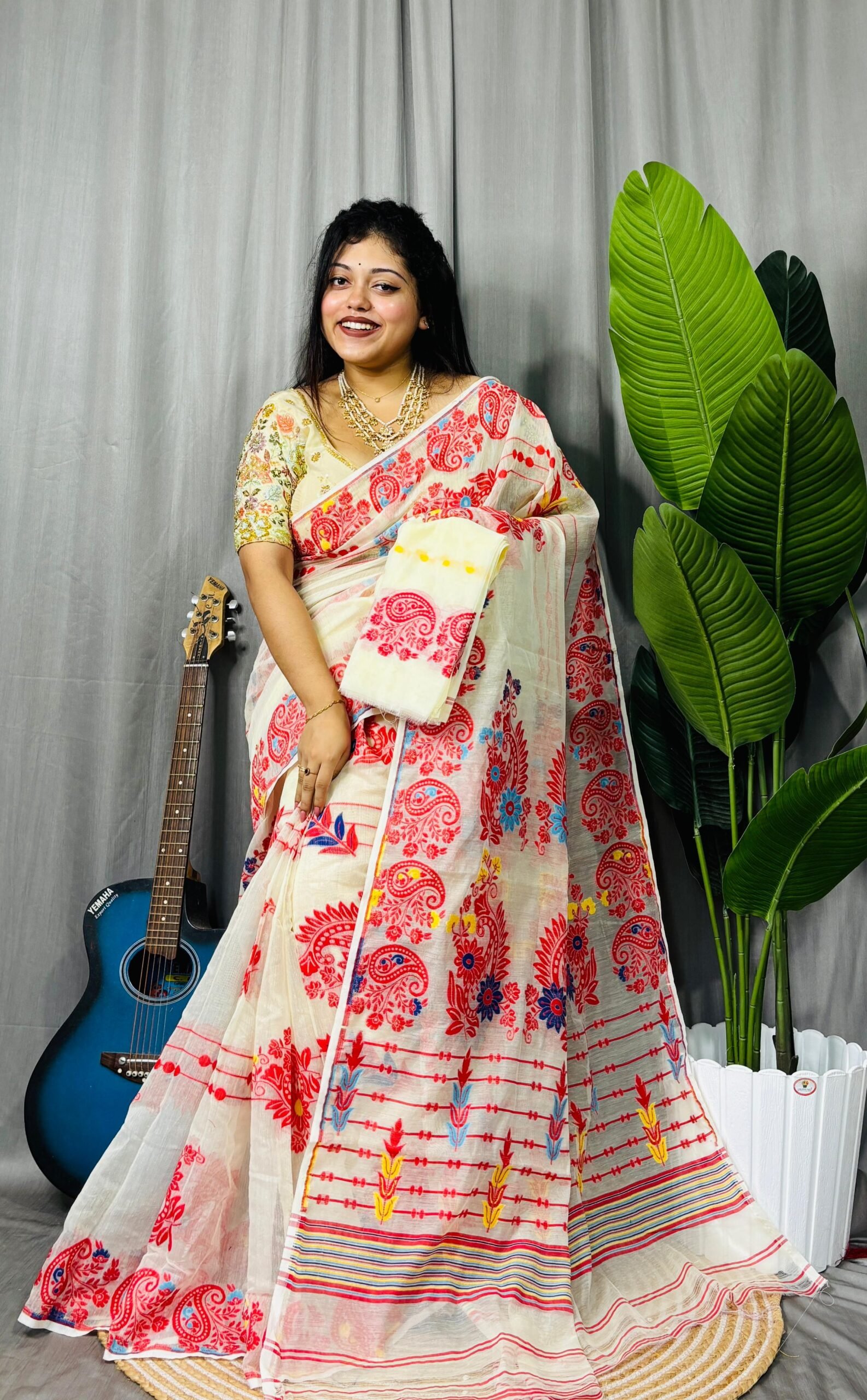 Par Kolka Soft Ghiye Red Jamdani Saree