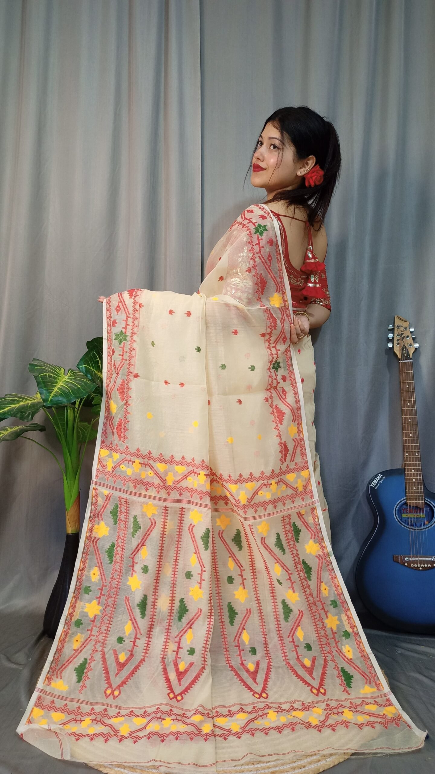 Be the first to review “Nokshimala Soft Cream Red Jamdani Saree” Cancel reply