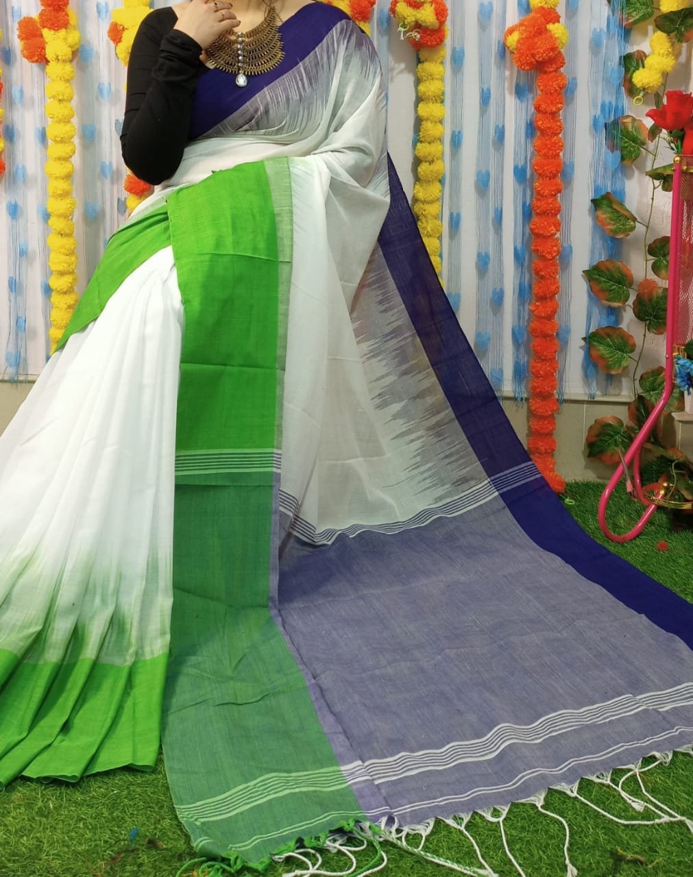 Mahapar 3D Cotton Green Blue Firoja Soft Saree